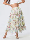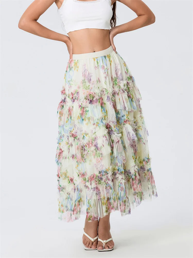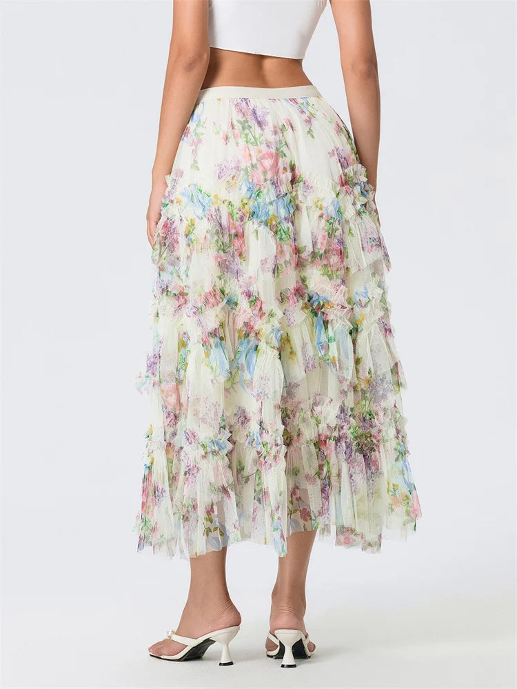 Light as air and bold in detail, this mesh floral skirt brings movement and charm to your wardrobe. Designed with a natural waist and irregular hem, it features soft ruffle accents and layered tulle for a semi-sheer, textured finish. Its patchwork floral print and flowing A-line cut make it ideal for spontaneous outings, seaside strolls, or fashion-forward streetwear.