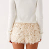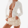 These sparkly low-rise shorts are built to steal the scene. Designed for nights out and bold entrances, they blend shimmering sequins with soft faux-fur texture and playful ruffle and bow details. Whether you’re headed to a rooftop party or dancing till sunrise, they bring unapologetic glam with a cheeky twist.