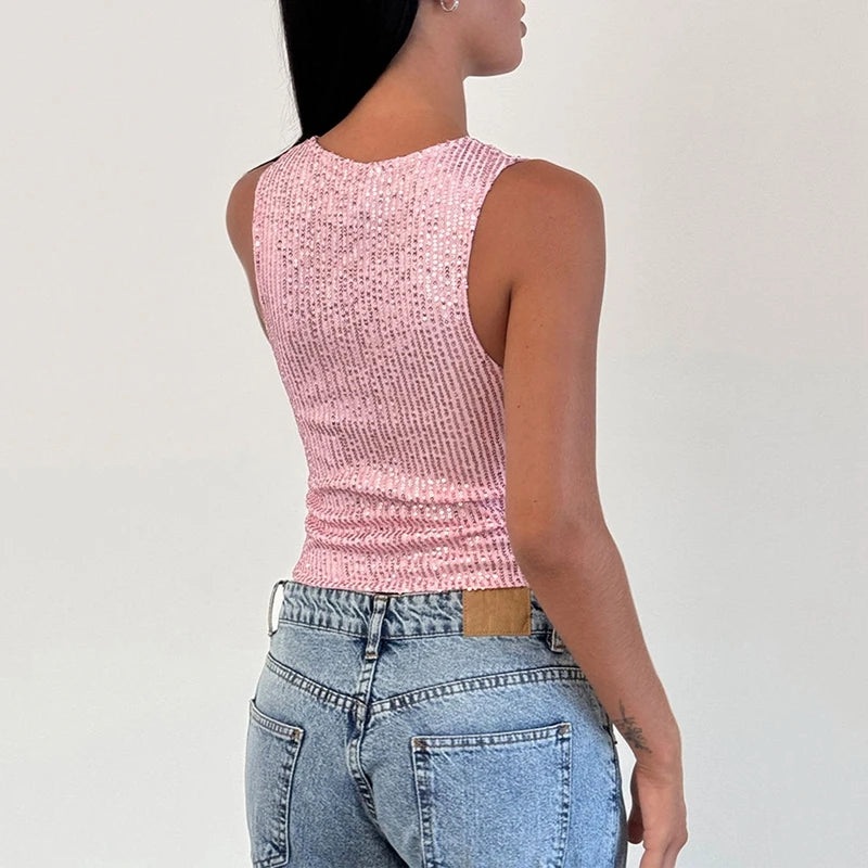 Built for the spotlight, this glittering tank top brings full shine energy to your summer fits. Covered in reflective sequins with a clean crew neckline and sleeveless cut, it's designed to hug close while keeping things effortless. Whether you’re headed to a club night or leveling up your day look, this top guarantees sparkle without compromise.