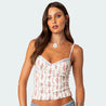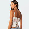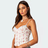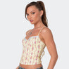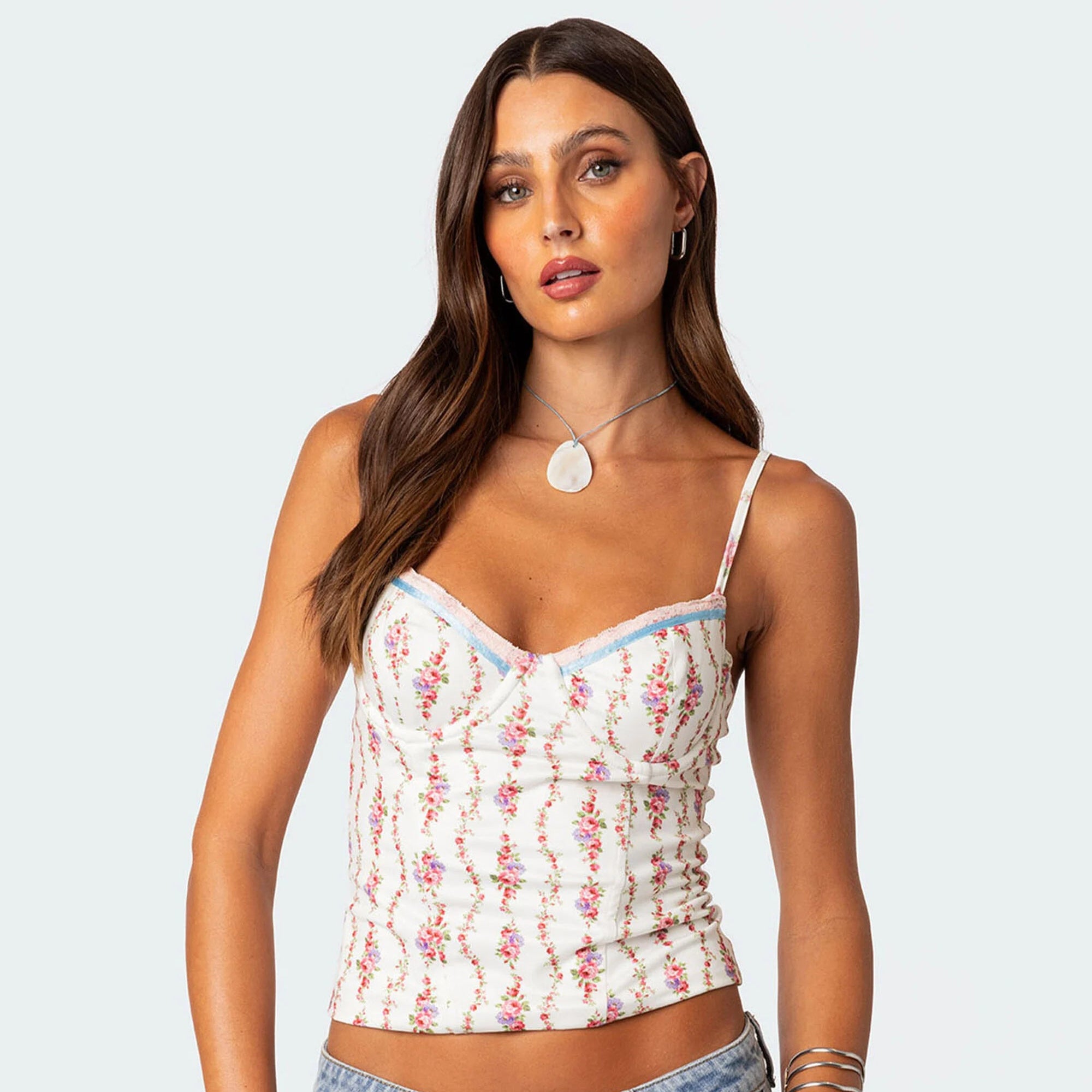 This floral cami top serves softness with a sharp twist. V-neck with lace trim, adjustable spaghetti straps, and an open back laced up like a corset. Lightweight but structured, it brings flirt and finesse to hot summer fits.