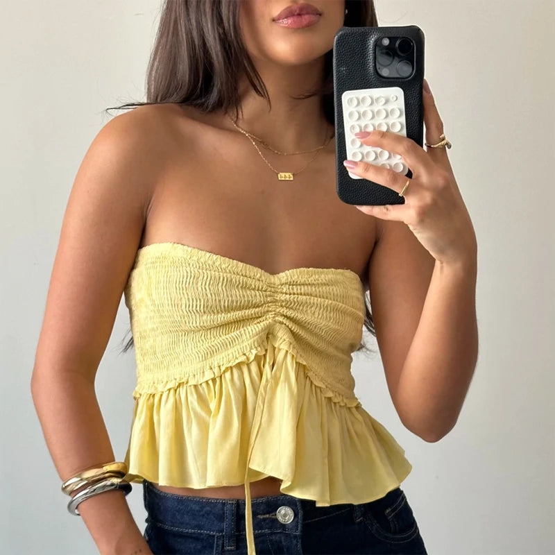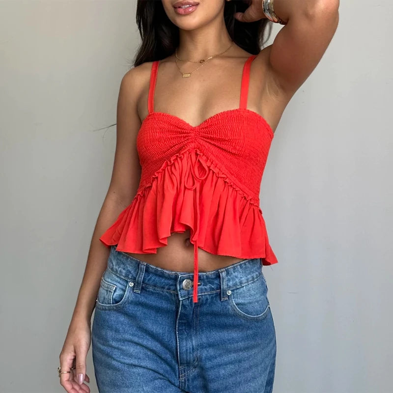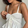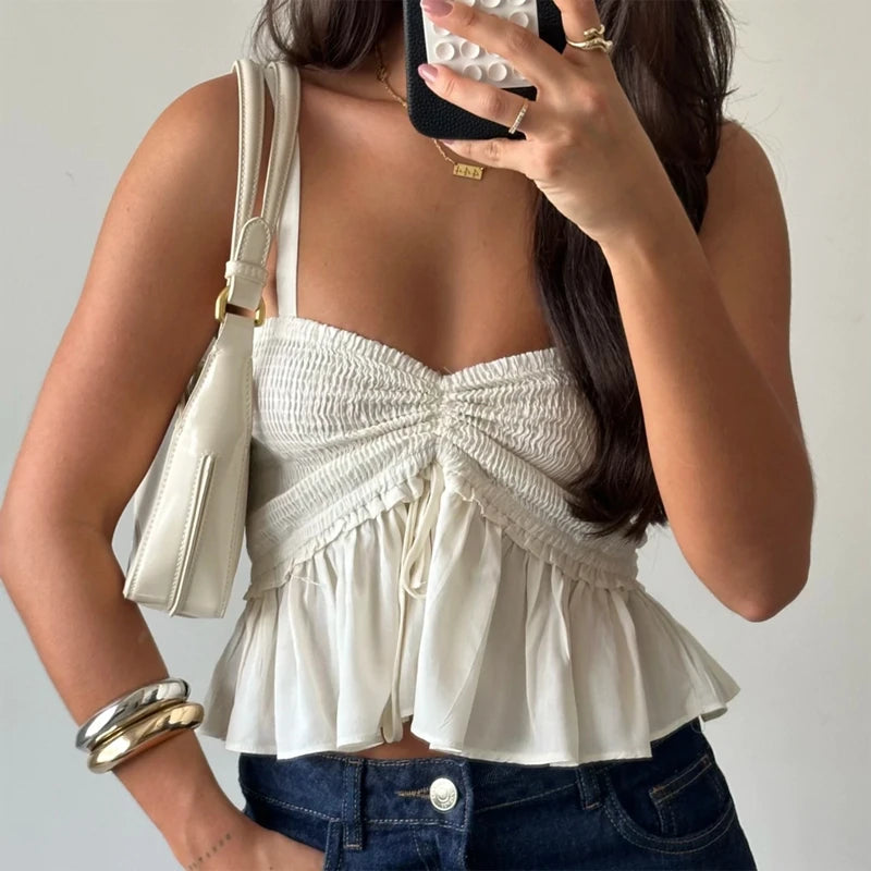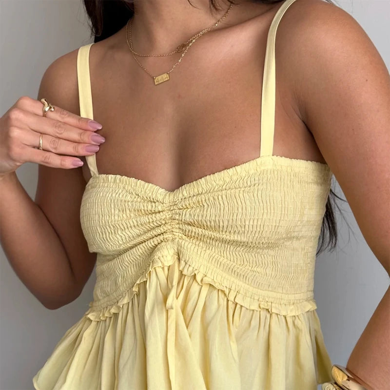 This shirred cami top combines a clean shape with gathered texture for a subtle twist. Cropped and lightweight, it holds its form without clinging. Ideal for warm days, styled solo or layered under loose cotton shirts.