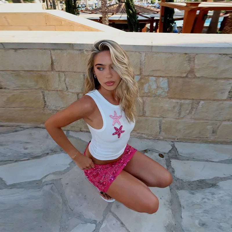 Match it with wide-leg trousers or tailored shorts for sleek contrast. Add heeled sandals and minimalist jewelry for a clean, elevated finish. Great alone or layered under a sheer overshirt.