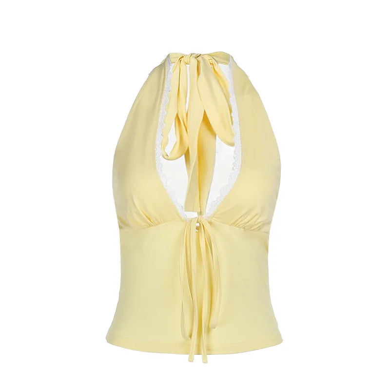 This solid-color tank top features a clean silhouette with lace patchwork at the neckline. Lightweight and slightly stretchy, it fits close without clinging. Easy to layer or wear solo—refined, simple, and versatile.
