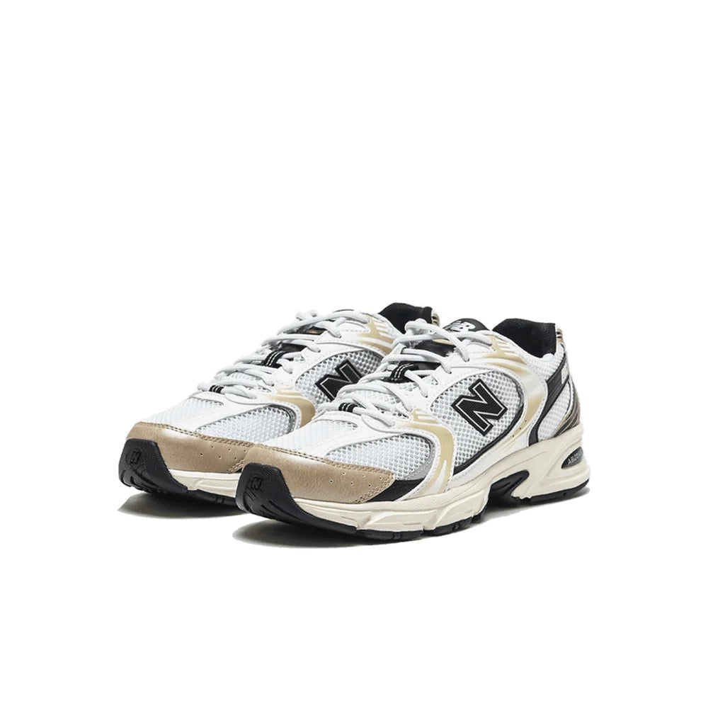 The New Balance 530 'White Gold' adds a touch of elegance with metallic gold accents over a clean white mesh and synthetic base. Lightweight cushioning offers a smooth and stylish ride.